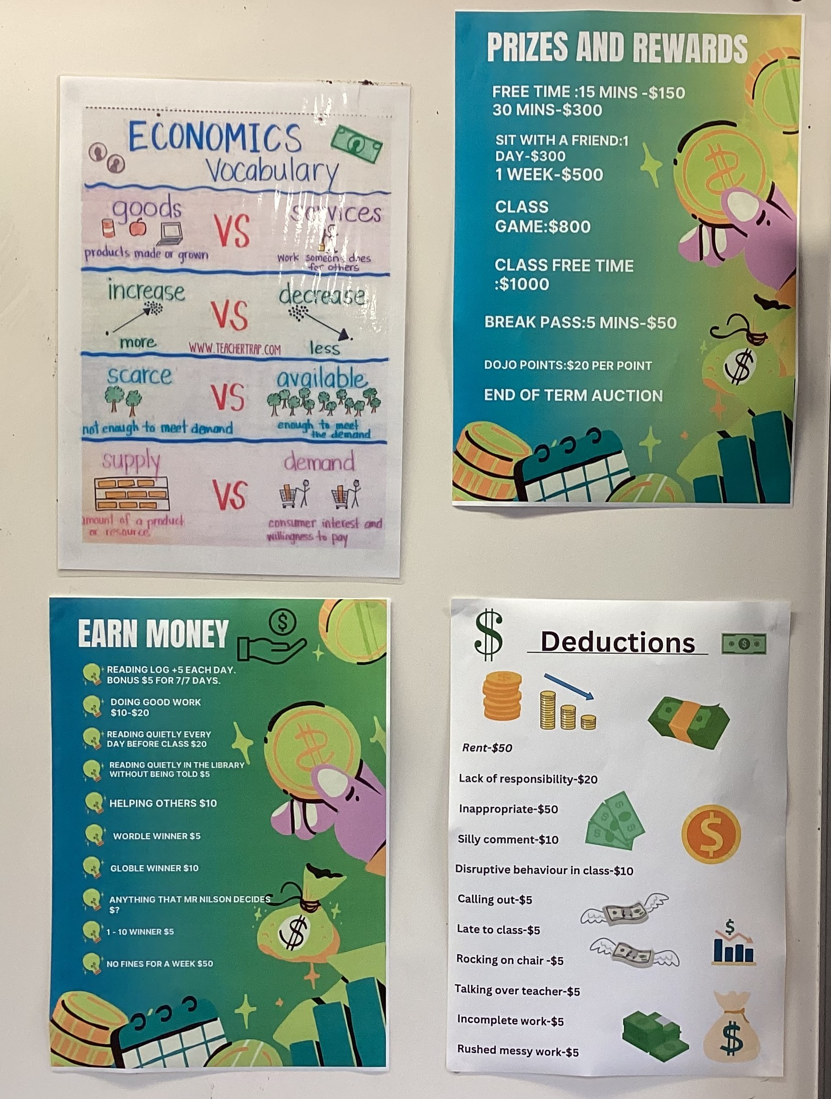 Students came up with the agreed ways of earning money, and also ways of losing money. Students were also expected to pay a weekly rent fee. This also taught the students accountability and responsibility for their things, actions and their work.