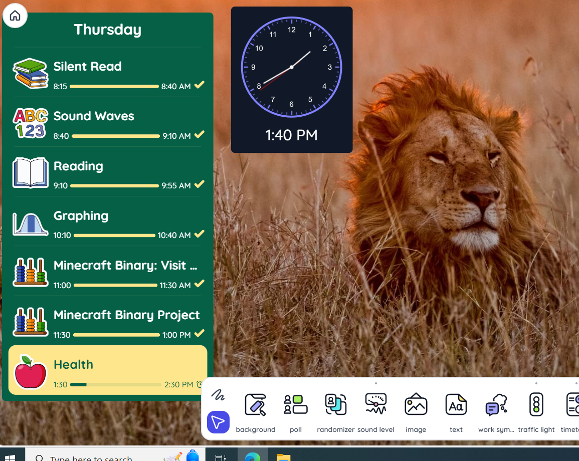 This is projected on the Smart Board throughout the day. It shows the daily timetable amongst many other classroom management features including Noise control, group maker, timer etc.